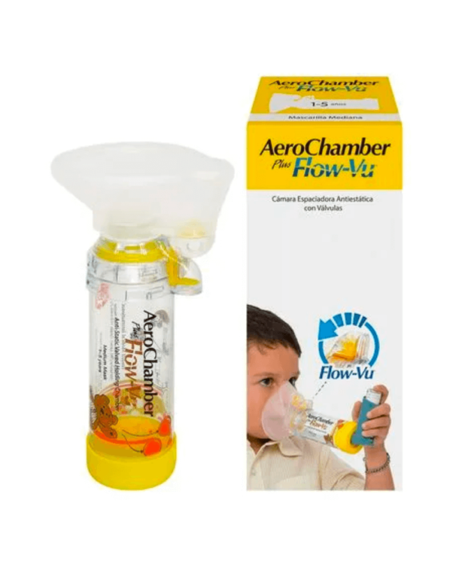 AeroChamber Plus 1-5años te ayuda a administrar medicamentos a los pulmones. Su diseño con indicador Flow-Vu se mueve con la inhalación proporcionando supervisión y depósito del medicamento. Se puede usar con todos los inhaladores de dosis media.